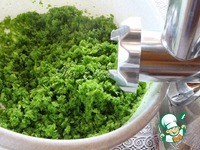 Стрелки провернуть в мясорубке. Мы любим, когда в соусе встречаются кусочки овощей, поэтому я использую самую крупную решетку для мясорубки. |