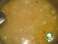 Попробовать на готовность горох и картофель. Добавить в кастрюльку обжаренные лук с морковью. Отрегулировать суп на соль, приправить черным перцем по вкусу. |