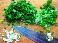 Мелко нарезать зелень укропа и петрушки, зеленый лук. Измельчить зубчик чеснока. |
