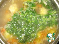 Вынуть лавровый листик из кастрюльки с супом, добавить зелень и чеснок. Дать закипеть и снять кастрюльку с огня. |