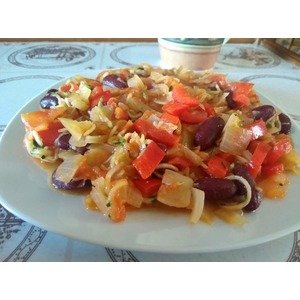 Фасоль для сытности, лук и помидорки играют важную роль для вкуса. Цуккини просто прекрасны с помидорами, а тимьян как вторая скрипка. Приятного аппетита! |