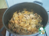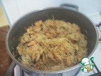 Теперь можно добавить мидии, добавляем соль, перец, приправу для плова и обжариваем еще минут 10. |