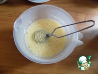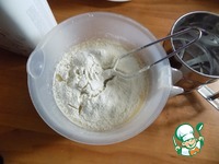 Муку соединяем с разрыхлителем и солью, просеиваем понемногу в смесь и замешиваем тесто по консистенции густой сметаны, но чтобы оно хорошо выливалось из посуды через носик. |