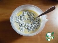 В тесто наливаем чуть остывшее растопленное масло сливочное, ложкой перемешиваем и выкладываем ягоды в муке, аккуратно их вмешивая в тесто. |