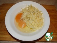 Разбить в миску яйца, чуть посолить, добавить к ним половину натертого сыра |