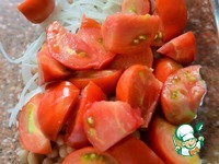 Помидоры вымыть, обсушить и нарезать крупными кусками, добавить в салатник. |