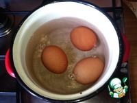 Яйца сварились. Кладем их в холодную воду секунд на 30, чтобы можно было держать в руке. Немного очищаем и чайной ложкой выкладываем содержимое яиц в миску с поджаренным хлебом. |