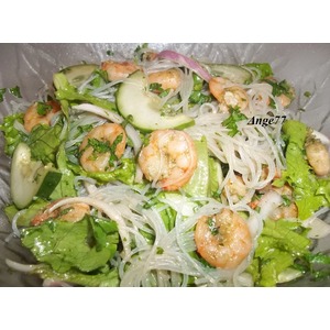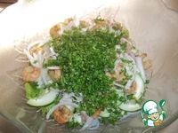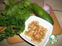 Основные продукты. Креветки я приготовила так: к креветкам добавила устричный соус, горчицу и зелень. В маленькой сковороде разогрела немного раст. масла, бросила половинку зубчика чеснока, как только масло запахло чесноком, убрала чеснок и быстро обжарила креветки. Лук нарезать перьями, если горький, замариновать предварительно в смеси уксуса с сахаром. Фунчозу приготовить согласно инструкции на упаковке (мне целая упаковка ни к чему, отрезала нужное количество вермишели ножницами, залила на 2 минуты кипятком, затем откинула на сито) |