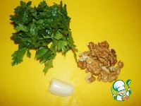 А пока делаем начинку: шинкуем зелень, рубим орехи, чеснок измельчаем, можно через пресс, добавляем к творогу, и кладем майонез. Солим по вкусу. У меня сванская соль. Перемешиваем. |