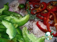 Лук порезать кубиками, чеснок мелко, перец болгарский полукольцами, майоран, черный перец-перемешать с курицей и залить вином. Оставить мариноваться 1 час. |