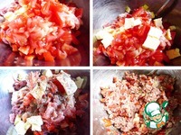 Пока подходит тесто, приготовим начинку. В миске смешать фарш, добавить мелко нарезанный лук (у нас лук очень жесткий, я взбила его в блендере), измельченный красный перец. |