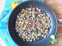Сыр трем на крупной тёрке. С баклажанов сливаем жидкость и обжариваем в небольшом количестве растительного масла до румяности. Добавляем мелко нарезанный чеснок, обжариваем еще пару минут. |