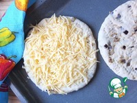 Делим тесто на две части. Формируем две лепешки. Выкладываем на противень (при необходимости смазать противень маслом), слегка накалываем вилкой. На каждую лепешку выкладываем сыр. |