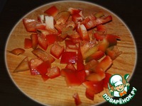 Мелко нарезать красный болгарский перец и тоже добавить в обжаривание, хорошенько перемешав. |