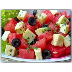 Описание: Салат из арбуза с мягким сыром и оливками. Сочный арбуз прекрасно утоляет жажду, листики мяты также добавляют свой неповторимый аромат свежести летнему салату. А оливки в комбинации с нежными кубиками сыра дополняют вкус и делают салат более сытным и вкусным.