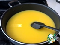 Наливаем апельсиновый сок в большую сковороду, добавляем сливочное масло и нагреваем |