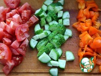 Нарезать крупным кубиком помидор, огурец, перец. |