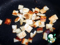 Питу крупно порезать и обжарить на оливковом масле до золотистого цвета, добавить в салат. |
