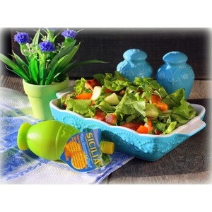 Полить заправкой, подсолить и подать к столу наш освежающий салат. |