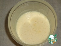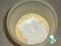 Насыпаем в тесто пшеничную муку с разрыхлителем. Размешиваем до однородности. |