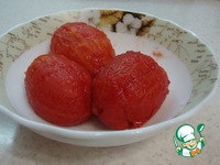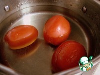 В кипящую воду положить помидоры, предварительно надрезав их минут на пять - десять для того, чтобы легко снять кожицу. |