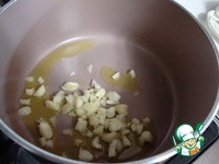 В сотейник добавить масло и очищенный крупно нарезанный чеснок. Обжарить. |