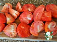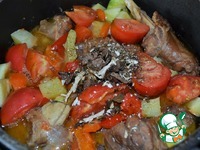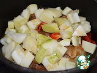 Помидоры вымыть, порезать на 4 части, не мельчите. В готовом блюде будет удобнее удалять кожицу от помидоров. Помидоры добавьте в казан, тушить 15 минут. |