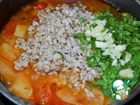 Добавить отваренную перловку, рубленную зелень сельдерея или петрушки, чеснок. Прокипятить пару минут и убрать с огня. |