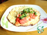 Помидор вымыть, обсушить, нарезать кубиками. Зелень вымыть, обсушить, порубить. Выложить кубики помидора на половинку омлета. Посолить, присыпать зеленью. |