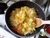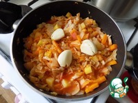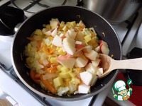 Очередь яблока. У яблока можно снять кожицу, я её оставила. Убираем серединку и режем произвольными кусочками. Тушим под крышкой минуты 2-3. |
