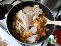 Выкладываем нарезанное мясо. У меня отварная индейка. |