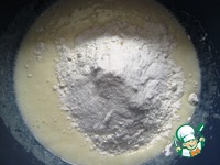 Всыпать муку и разрыхлитель теста. Перемешать до однородного состояния. Тесто по консистенции гуще, чем на оладьи, с ложки не стекает. |