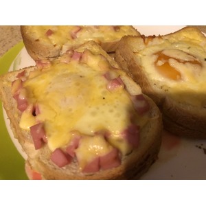 Делаем 3 разных бутербродика. Один ломтик хлеба кладем целым, присыпаем сыром, у второго вынимаем мякишь и кладем сверху. В выемку от мякиша кладем начинки:1.:помидор, прованские травы, яйцо, соль, сыр 2:колбаса, яйцо, сыр 3:колбаса и сыр. Запекаем 8 минут в разогрeтой до 180 градусов духовке. Приятного аппетита!!!