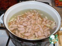 Добавляем копченую грудку. Доводим до кипения и кипятим 5 минут. |