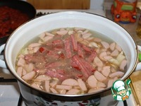 Добавляем колбасу. Доводим до кипения и кипятим 5 минут. |