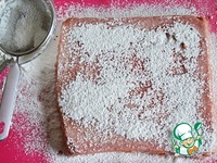 Квадратную форму размером 20*20 застилаем пекарской бумагой и присыпаем тонким слоем смеси сахарной пудры и кукурузного крахмала. |