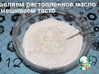 В муку добавляем подошедшие дрожжи, растопленное сливочное масло. Замешиваем тесто. |