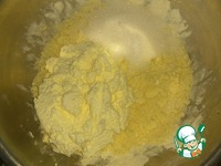 Муку перемешать с разрыхлителем. Добавить порезанное на кусочки масло, растереть руками в крошку. |