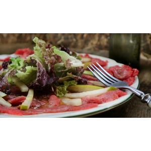 Описание: Блюдо из тонко нарезанных кусочков свежей говяжьей вырезки с добавлением маринованных в апельсиновом соке ломтиков груши. Посмотрите как мы приготовили его для Вас! Это идеальная закуска для поддержания сил. Готовьте и наслаждайтесь!