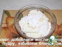 В творог добавляем масло и сахарную пудру. Хорошо взбиваем блендером. |