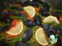 Укладываем сверху сливы и дольки лимона. Тушим на медленном огне под крышкой около 40 минут. |
