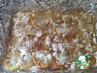 Выстилаем керамическую (или стеклянную) форму для запекания фольгой, смазываем ее оливковым маслом и выкладываем баклажаны на дно с нахлестом. Присыпаем мукой |