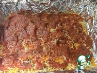 Покрываем баклажаны половиной томатного соуса. Важно не переборщить с количеством соуса - иначе готовое блюдо будет "течь" |