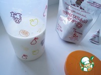 Сначала нужно заранее приготовить йогурт. Для этого в специальную тару нужно налить 0,5 л молока. Добавить 1/2 пакетика закваски и тщательно перемешать в течение 2-3 минут. |