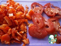 Нарезать кубиками болгарский перец, помидор кружочками. |