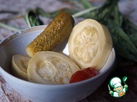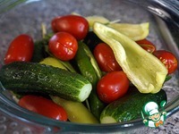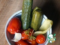 Для рассола налить в кастрюлю 1,5 л воды, добавить соль, мед, пару горошин душистого перца. Заварить в небольшом количестве кипятка сразу оба пакета чая, пакеты выкинуть, чай добавить в будущий рассол. Поставить на плиту, довести до кипения. Пока готовится рассол, подготовим овощи. В стеклянную кастрюлю уложить на дно фрагмент листа хрена, листик смородины, венчик укропа, немного листочков и пару подавленных зубчиков чеснока, сверху вперемешку – огурцы, помидоры и перец. Затем снова – укроп, хрен, смородина, чеснок, опять овощи – и так до верха, но с тем расчетом, чтобы поместился рассол и можно было чуть придавить тарелкой. Завершить «конструкцию» еще одним слоем зелени. |