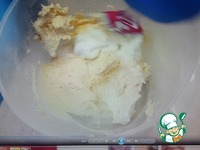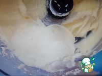 Масло взбиваем с сахарной пудрой, добавляем желток, творог и взбиваем. Затем просеиваем муку с разрыхлителем. Взбиваем. В конце добавляем белок и аккуратно перемешиваем лопаткой. |