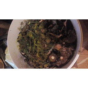 Последний слой грибов пересыпаем солью, сверху кладем опять веточки укропа, закрываем все листьями хрена. |