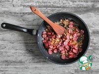 Колбаски нарежьте тонкими кружочками, положите в луковую смесь, прогрейте. |
