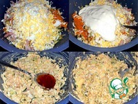 Яйца натёрла на крупной тёрке и высыпала их в миску. Положила майонез, хрен, насыпала соль, перец и перемешала салат. Добавила соус и опять перемешала. |